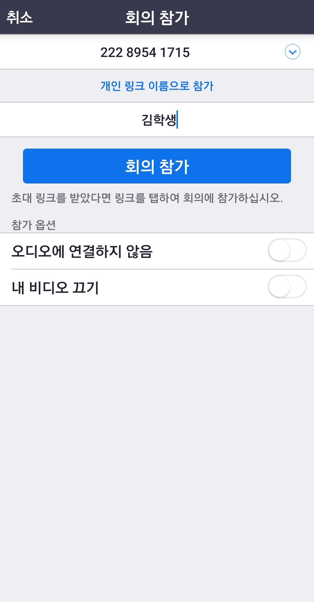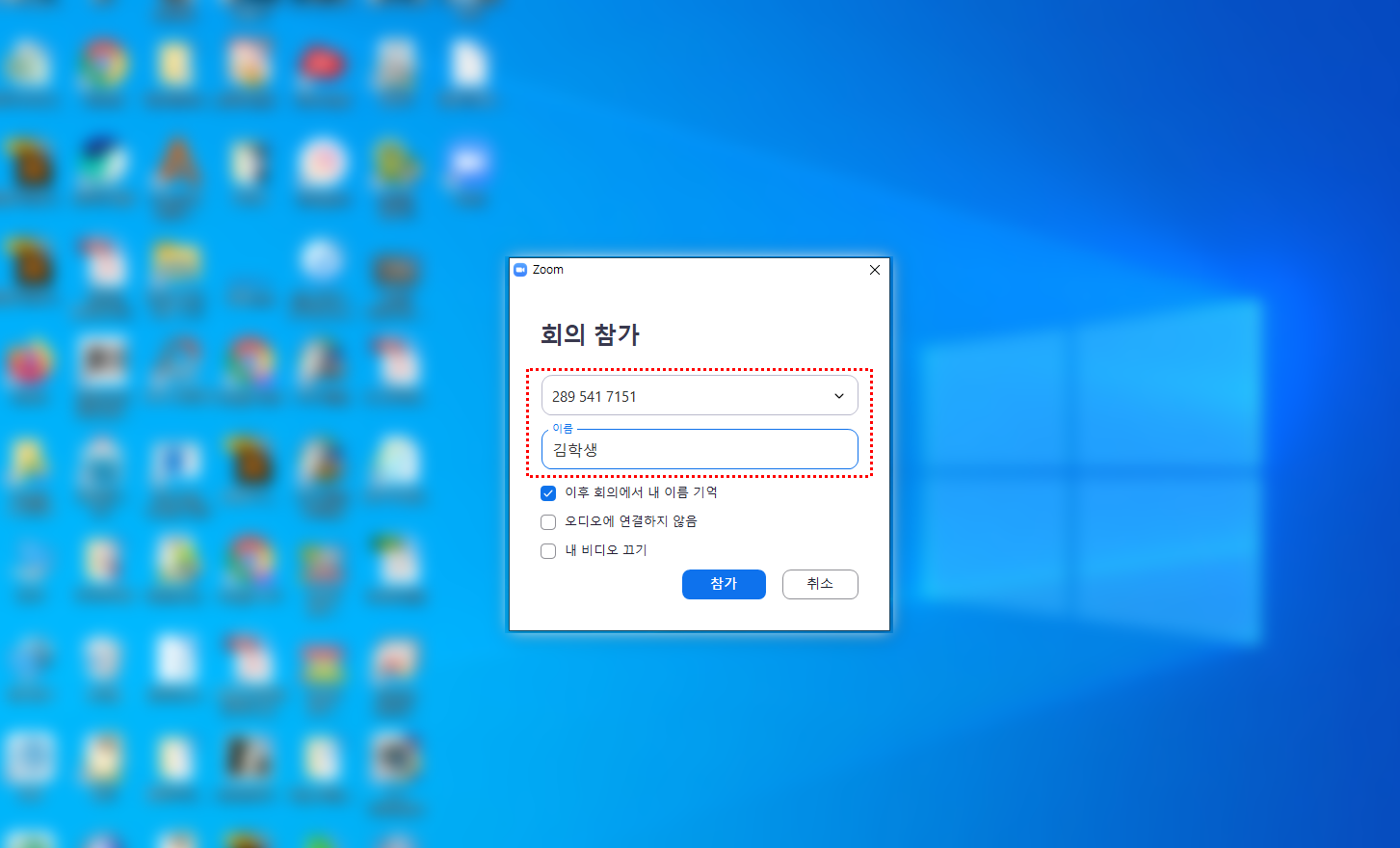 3. 각 교실에 해당하는 회의ID와 본인 실명 이름을 입력하고 참가 버튼을 누릅니다.(실명 이름 미기재시 결석 처리 됩니다.)