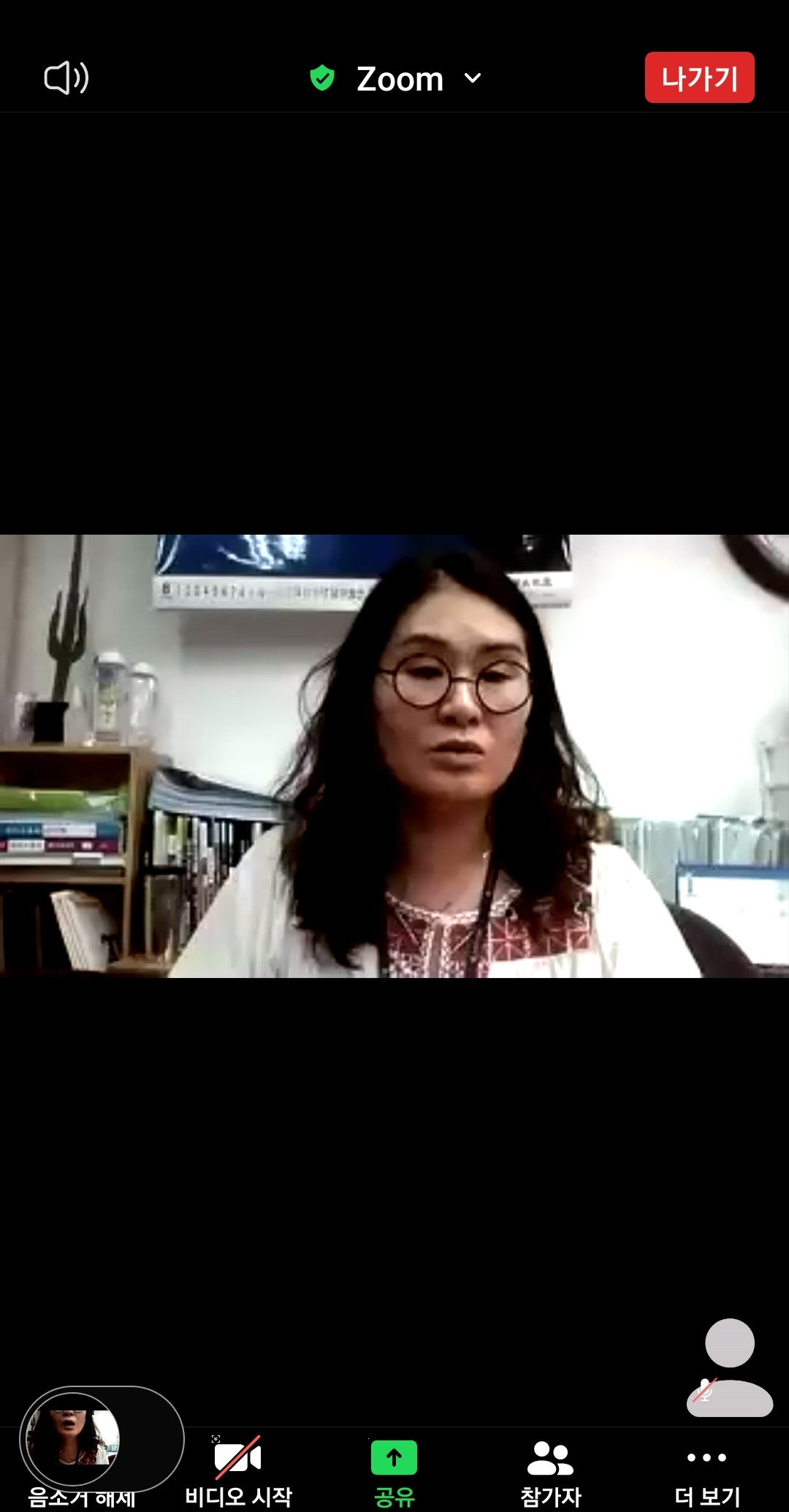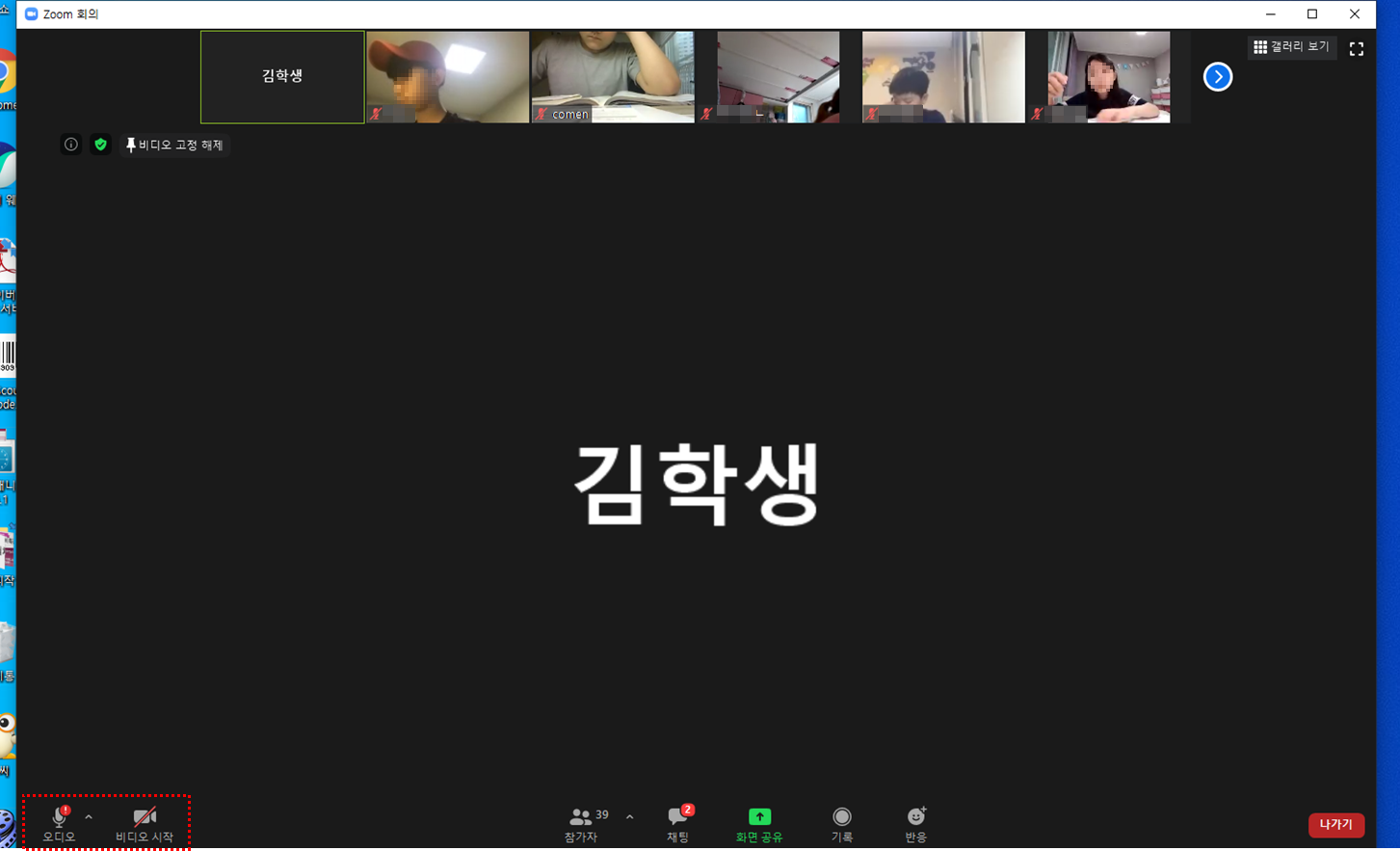 6. 선생님이 수락하게 되면 수업 참여하게 되며 왼쪽 하단에 오디오가 해제되었는지, 비디오시작이 해제되었는지 여부 체크후에 상황에 맞게 조작하면 됩니다.