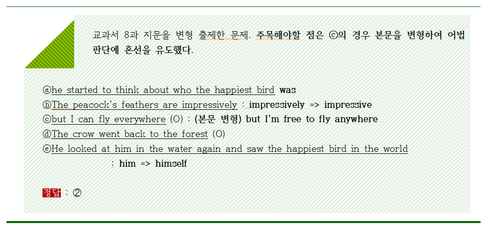 객관식 30문항(100점) 출제되었고 영영풀이 출제 비중 늘어남(2문항->4문항). 특히 시험범위의 지문이 조금씩 변형되어 암기에만 익숙한 학생들은 당황할 수 있었음. 다만, 객관식의 문제 난이도가 일부를 제외하고 높지 않았기 때문에 난이도는 중으로 볼 수 있습니다. 시험범위 내의 지문을 암기하면서 여러 번 쓰는 연습을 해보고 기본적으로 지문에 있는 문장들이 변형될 수도 있음을 알고 대처해야 한다.