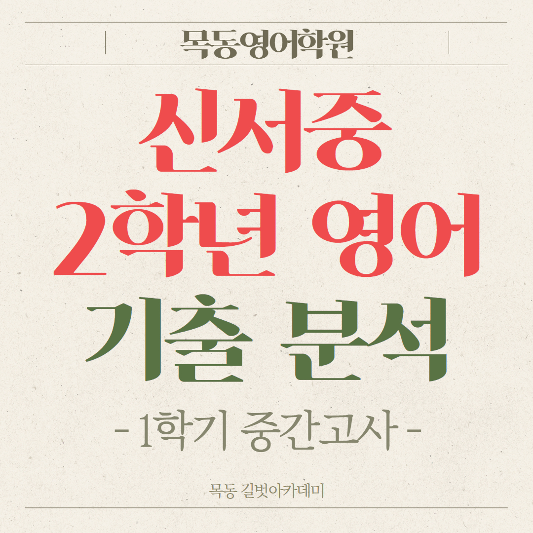 안녕하세요. 오늘은 목동영어학원 길벗아카데미에서 신서중 2학년 1학기 영어 중간고사 기출문제를 분석해 드리려고 합니다!