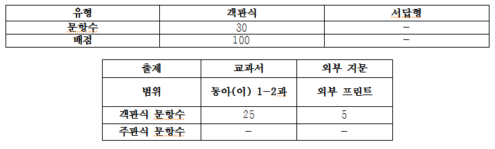주관식/서술형 문제 없이 선택형으로만 이루어진 무난한 시험이었습니다. 대화문 4문항 (외부 지문 1문항 포함), 어휘 3문항 (중 영영풀이 1문항), 어법 9문항, 본문 14문항 (외부 지문 5문항 포함) 으로 구성되었고, 비율이 상대적으로 높은 어법 문제 중에서도 비교적 난이도가 높고 풀이 시간을 많이 소비하는 복수 선택 / ‘옳은 선지 짝짓기’ 형 문항이 다수 있어 주의가 필요한 면이 있었습니다. 어휘 문제의 경우 비율 자체는 낮은 편이었으나, ‘빈칸 어디에도 들어갈 수 없는 단어 선택’과 같이 모든 선택지를 숙지하고 있어야 해결 가능한 고난도 문항이 전부를 차지했기에 이 역시 중위권 학생들에게 어려울 수 있는 지점이었습니다. 다음 시험 대비 시, 중등 내신 공부의 기초인 교과서 본문의 완벽한 암기 및 속독 연습을 통해 비교적 쉬운 독해 문제에서의 불필요한 시간 소모를 단축함에 더해 어휘와 어법의 충분한 숙지 (기계적-도식적 이해[어휘의 경우 번역어의 단순 암기]를 넘어선, 정확한 정의를 기반으로 실제 텍스트에서의 다양한 용례를 이해하고 사용할 수 있는 입체적인 숙달)에 특히 신경쓸 필요가 있겠습니다.