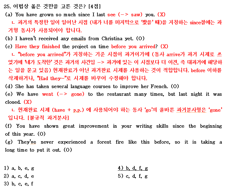 틀린 보기 중 (a)와 (e)의 경우 각각 현재완료 시제 문장에서 since절의 사용과 과거분사의 형태 (그 중에서도 흔한 동사인 go) 에 관련된 오류이기에 배제하기가 상대적으로 쉬웠으나, 현행 진도만을 기준으로 공부하여 다른 완료 시제들을 따로 배우지 않은 학생들에게는 보기 (c)가 복병으로 작용했을 것으로 보입니다. “현재완료 시제는 ‘현재를 기준으로, 과거에 일어나거나 시작된 일의 결과나 영향이 지금까지 이어지고 있음’을 나타내는 것”이라는 정의를 확실하게 숙지하고 있고, 이 지식을 기반으로 과거 시제의 before 절과는 함께 사용할 수 없음(기준 시점이 과거이므로)을 정확하게 추론해 낼 수 있어야 하는 문제였습니다.