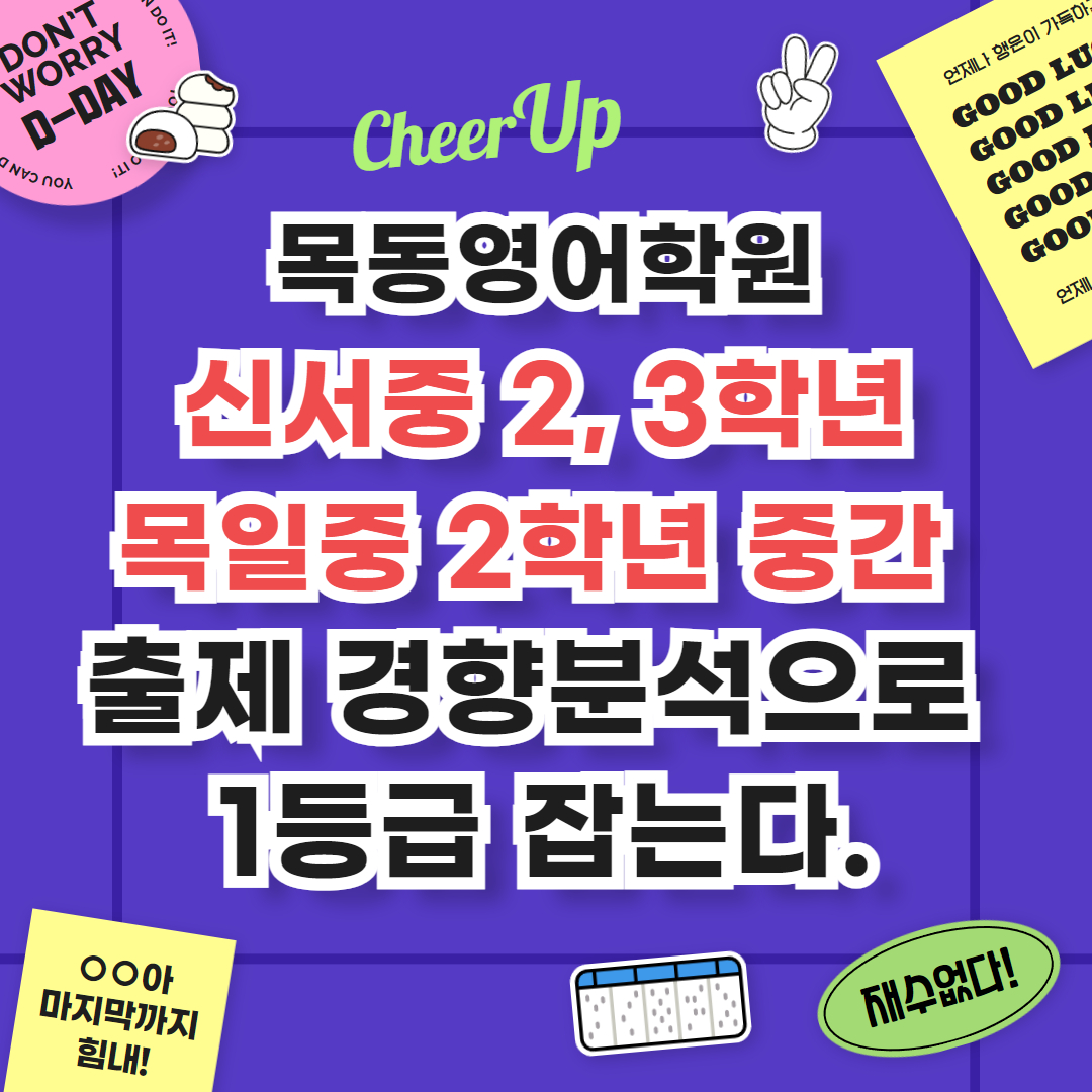 그럼 이상으로 목동권 내신대비 전문 목동영어학원 목일중, 신서중 1학기 중간고사 3개년 분석 포스팅을 마치도록 하겠습니다~!