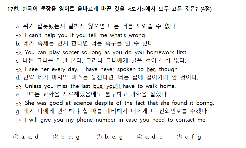 객관식 100% 총 32문항으로 출제되었습니다. 교과서 2개과의 지문과 외부지문 2개에서 출제되었으며 난이도가 있는 다소 어려운 시험이었습니다. 서술형이 없지만 올바르게 영작된 문장을 고르는 문제가 출제되므로 타켓 문법에 대한 정확한 개념와 응용 영작 스킬이 필요합니다. 지문 내용이해에 관한 문제들의 몇몇은 보기가 영어로 나와, 꼼꼼한 독해 능력을 요합니다. 단순히 하나의 답을 찾기보다는 지문의 복수의 빈칸을 뚫고 답이 올바르게 묶인 것을 찾는 문제가 다수임으로 지문을 완전히 숙지하는 것이 큰 도움이 될 것입니다.