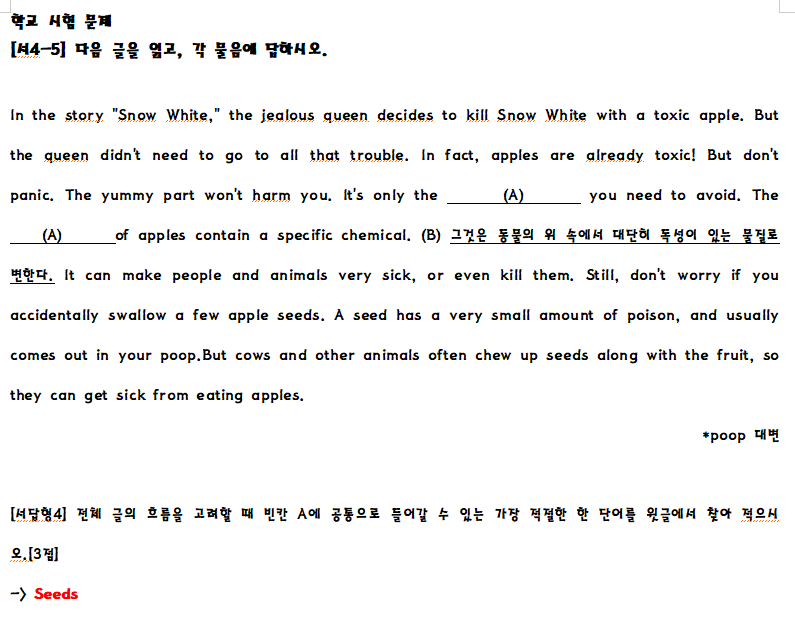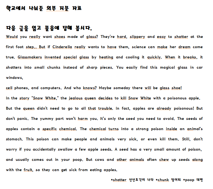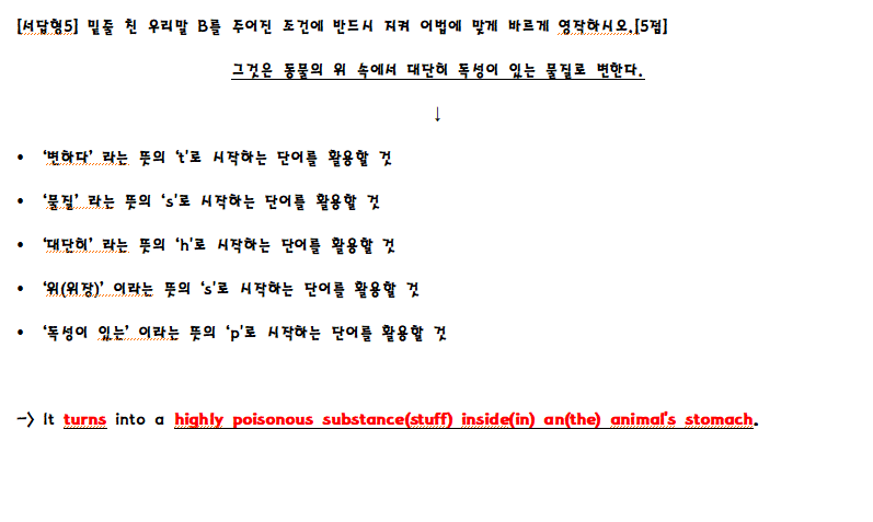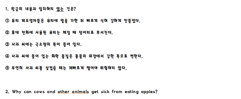 쉬운 문제라고 할수 있는 문제가 별로 없었음. 특히 어법 문제는 문장 하나만을 골라내는 것이 아닌 문단을 주고 이 문단에서 어법이 틀린 문장을 선택하라는 문제는 마치 한 문제에서 여러 문제를 풀어야 한 문제를 맞힐수 있는 문제가 출제 된 점은 앞으로 기본 어법 학습이 필수적이라고 느껴짐. 또한 외부지문에서 나온 서술형 문제의 어휘 수준은 중2에서 나오는 수준의 문제는 아닌 것으로 판단됨.
