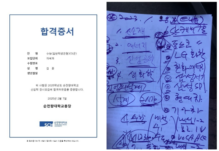 순천향 대학교 합격증과 대표원장님의 상담 내용