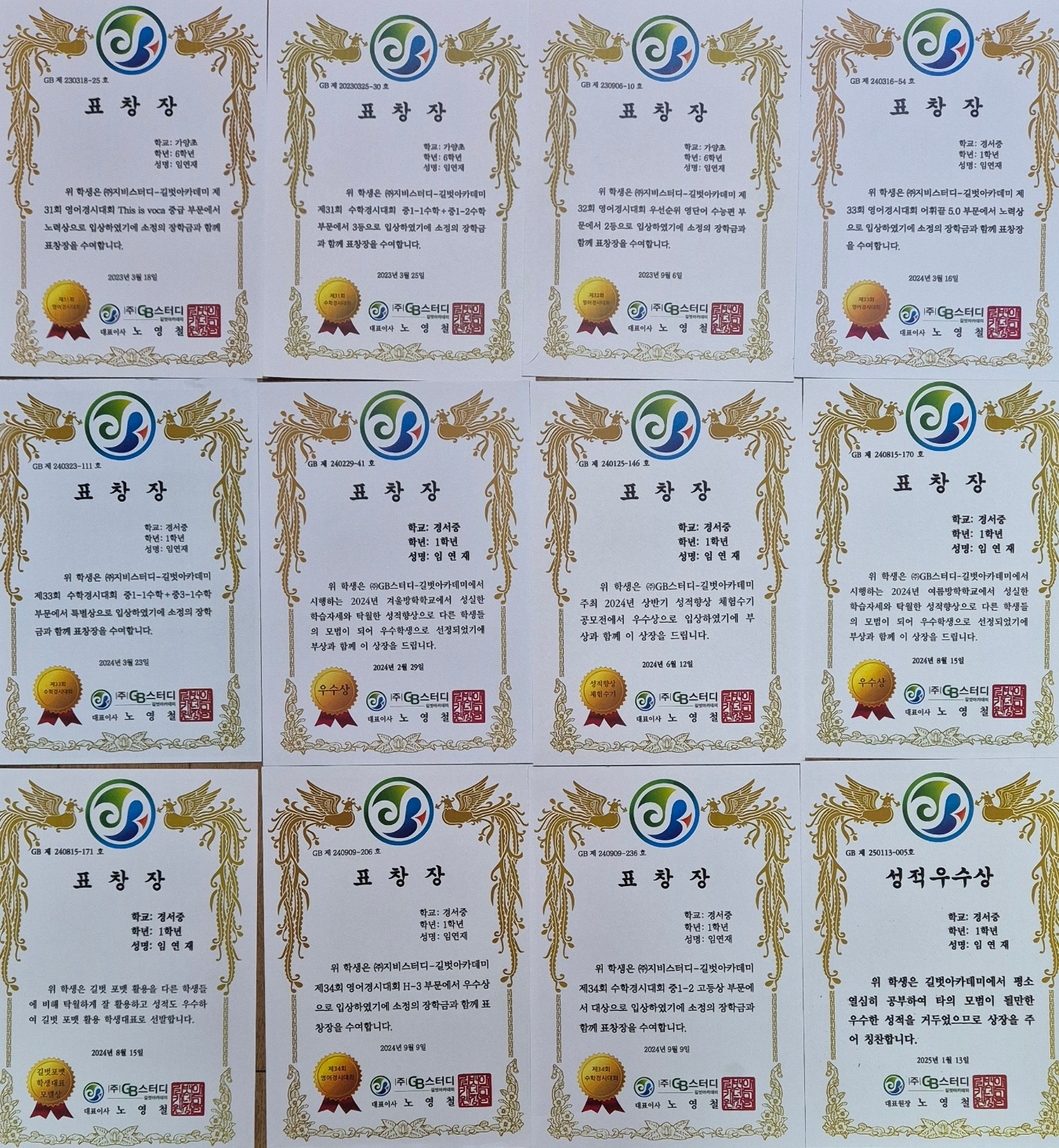 아이가 초등 5학년 때부터 길벗을 다니며 받은 상장입니다.