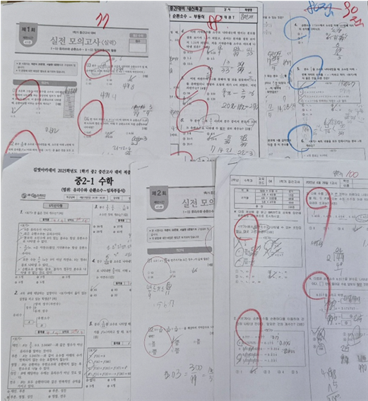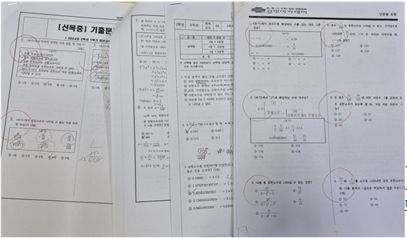 신목중학교 기출 문제를 시간을 정해 풀어보고 틀린 문제 혹은 어려웠던 문제 유형을 따로 프린트해서 준비시켜주셨고요.
