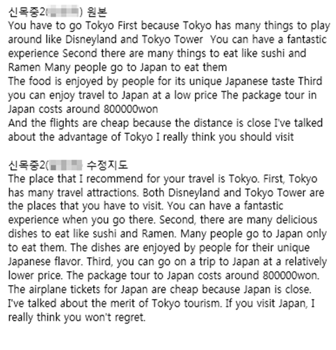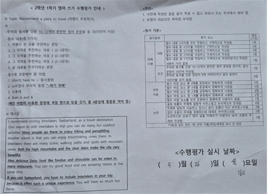이번에 영어 수행평가가 여행지에 대한 내용으로 필수 어법을 포함하여 영작을 하는 것이었는데요. 아이 나름대로 쓰긴 했지만, 이게 문법에 맞게 쓴 건지 좋은 점수를 받기 위한 요건은 충족되었는지 걱정되었는데요. 수행평가도 길벗아카데미 영어 선생님께서 알아서 딱 정리해서 준비시켜 주시더라고요.