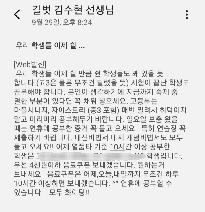 수현쌤이 늘 강조하시는 '공부는 습관이다' '행운은 꾸준히 하는 사람에게 찾아온다'를 명심하고 실천하면 언젠가 1등급, 100점도 받아보겠죠..?ㅎㅎ