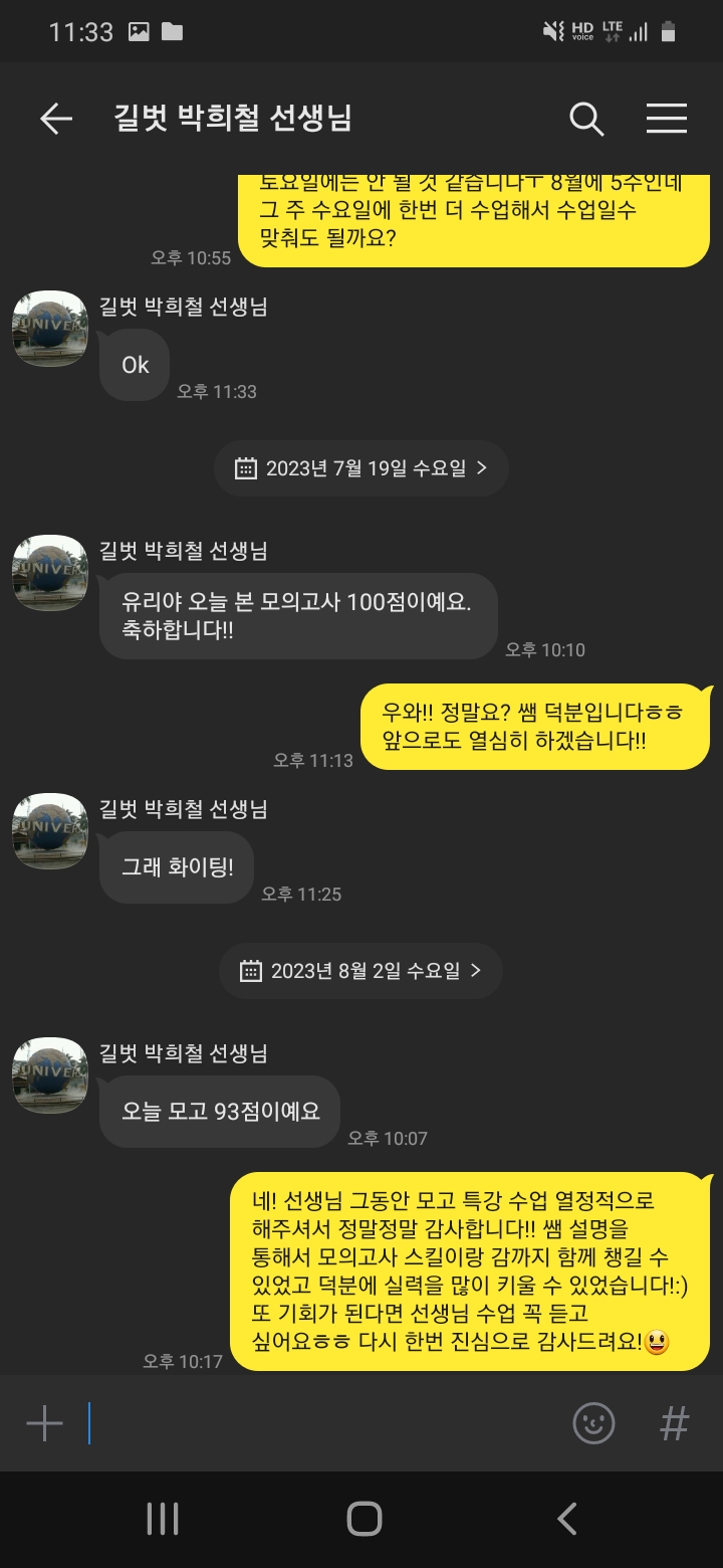 이는 제가 부족하고 필요한 영어 모의고사 실력을 키울 수 있도록 새로 반을 만들어 주신 것에서 알 수 있습니다. 모고특강반에서 4개월 동안 공부하니 아예 감도 못잡던 제가 고1 모고 100점을 거뜬히 맞게 되었습니다! 저를 가르쳐주신 강미진 선생님, 박희철 선생님 감사합니다!